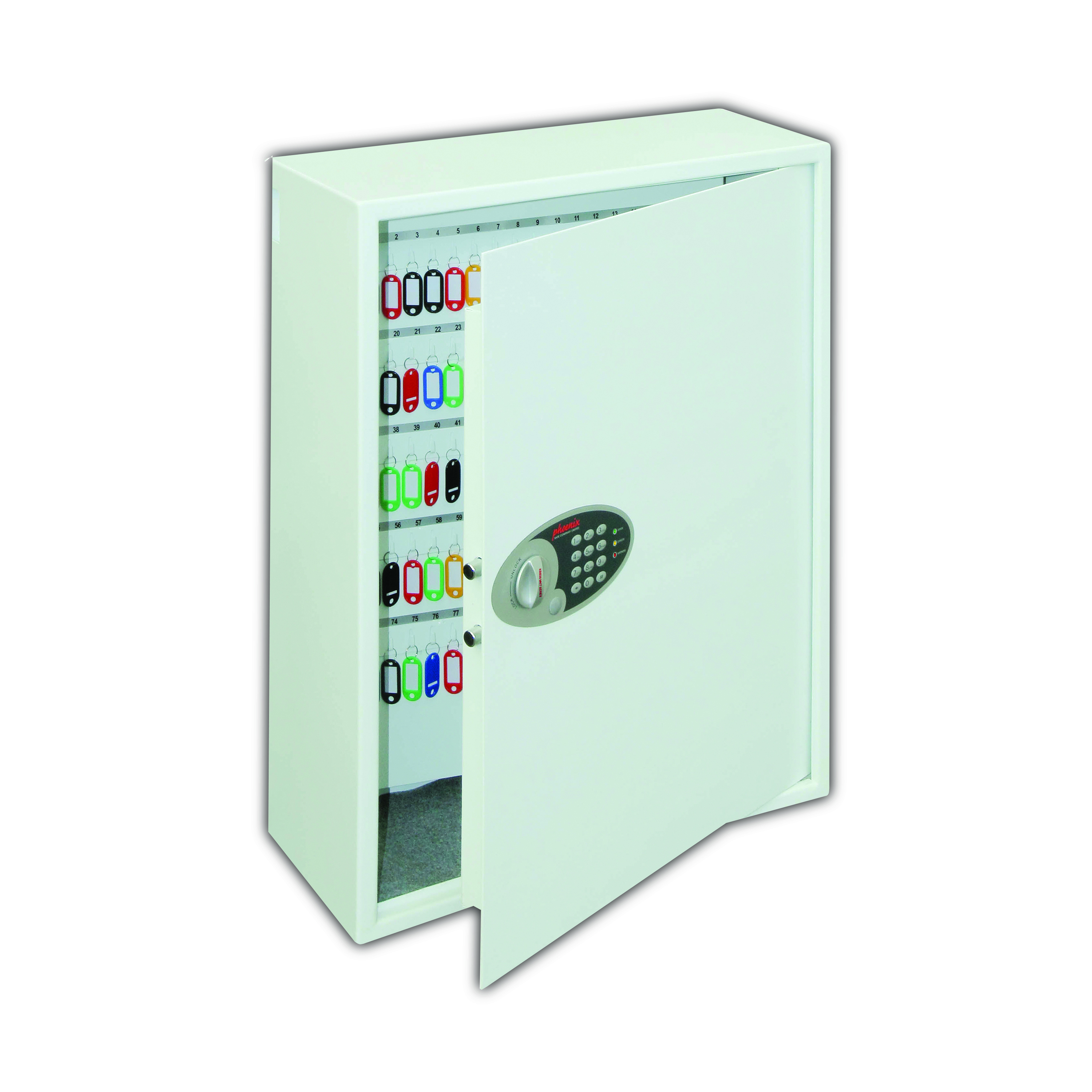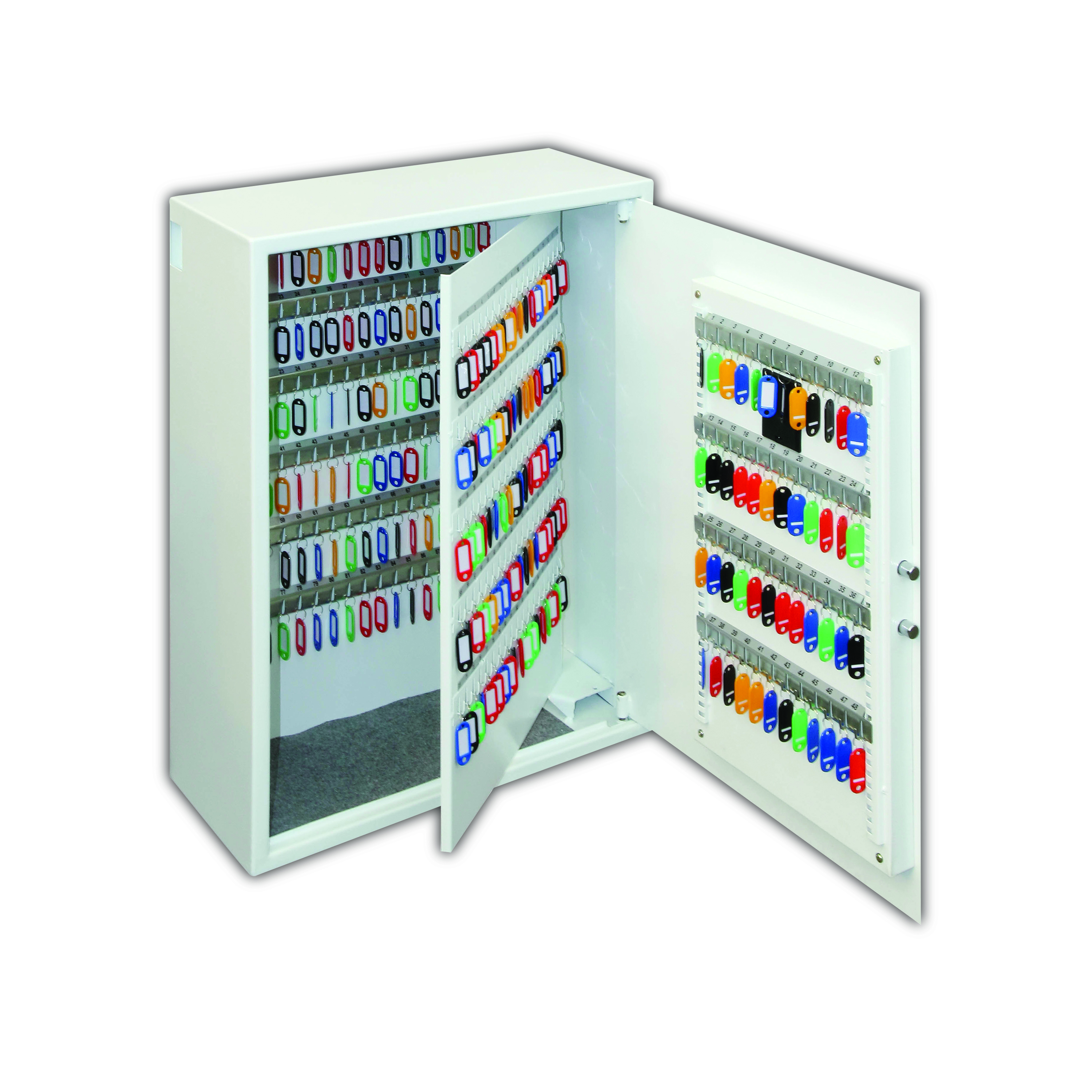 NO OF KEY HOOKS - 30, 48, 144, 300, 500 or 700 | LOCKING - Fitted with an advanced 'user friendly' electronic locking with anti-tamper or bounce solenoid locking System. For added peace of mind these safes are fitted with a key override facility should the code be misplaced (2 Keys supplied). | SECURITY - When bolted to a wall these key Safes provide defence against burglaries aimed at stealing car keys, house keys, office keys etc | FIXING - Ready prepared for fixing to the wall with bolts supplied | SPECIAL FEATURES - A unique key deposit slot allows keys to be deposited without the need to open the safe | DEPOSIT SLOT - 55H x 35W x 15Dmm | KEY TAGS - Supplied complete with a selection of coloured key rings | COLOUR - Finished in a high quality scratch resistant paint RAL9003 White.